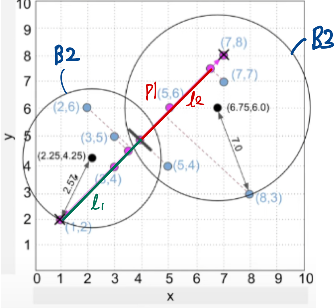 ๋‹ค๋ฅธ Point๋“ค์„ ๋‚˜๋ˆ„์–ด์ง„ ๊ฐ ์„ ์— ์ˆ˜์„ ์˜ ๋ฐœ์„ ๋‚ด๋ฆผ(=projection), ๊ฐ ์„ ๋“ค์— ํˆฌ์˜๋œ ์ ๋“ค์˜ ์ถ• ์„ฑ๋ถ„์— ํ•ฉ์˜ ํ‰๊ท ์„ ์ƒˆ๋กœ์šด Ball์˜ ์ค‘์‹ฌ์ ์œผ๋กœ ๊ฐ๊ฐ ์ƒ์„ฑ (๋‹จ, ์—ฌ๊ธฐ์„œ P1์€ ์ œ์™ธ๋œ๋‹ค. ์™œ๋ƒํ•˜๋ฉด ์ด๋ฏธ P1์„ ์ค‘์‹ฌ์œผ๋กœ ๋ชจ๋“  ์ ์„ ํฌํ•จํ•˜๋Š” Ball1์„ ๋งŒ๋“ค์—ˆ๊ธฐ ๋•Œ๋ฌธ์— ํ•˜์œ„ Ball ์ƒ์„ฑ ์‹œ์—๋Š” ์ œ์™ธ๋œ๋‹ค.)