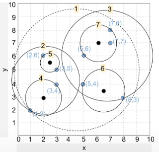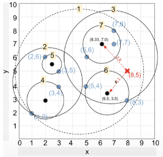 ์ตœ์ข… Ball(B6) ๋‚ด Point๋“ค ๊ณผ์˜ ์œ ํด๋ฆฌ๋“œ ๊ฑฐ๋ฆฌ๋ฅผ ์‚ฐ์ถœํ•œ ํ›„, ๊ฐ€์žฅ ๊ฐ€๊นŒ์šด Point(8,3) ์„ ํƒ