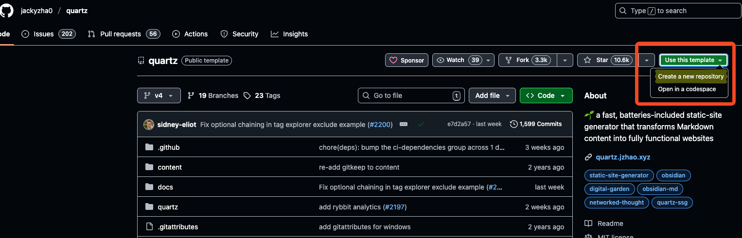 Github의 Quartz 페이지를 방문하여 해당 템플릿을 나만의 repository에 복사하여 새로운 저장소를 생성한다.