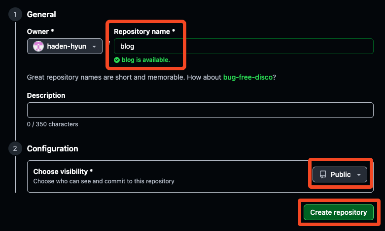 ‘Repository Name’ 입력 → ‘Public’ 설정 → ‘Create Repository’