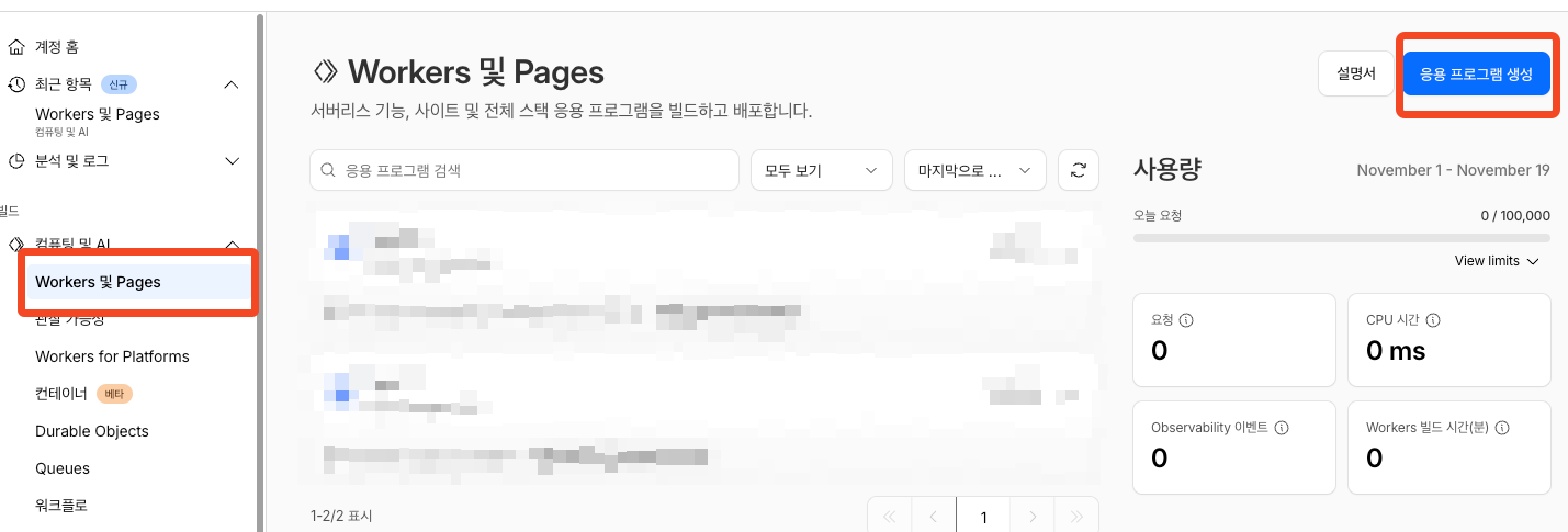 ‘빌드’ → ‘Workers 및 Pages’ 탭 → ‘응용 프로그램 생성’