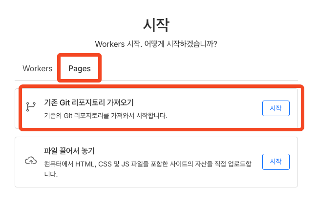 ‘Pages’ 탭 → ‘기존 Git 리포지토리 가져오기’