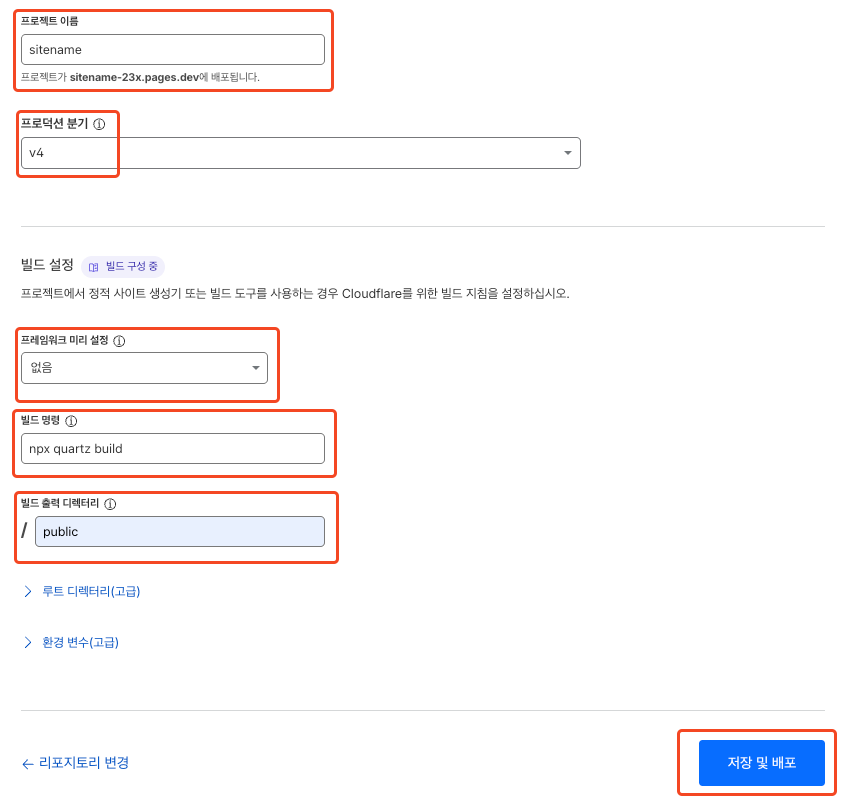 사이트명) → 프로덕션 분기(v4) → 프레임워크 미리 설정(없음) → 빌드 명령(npx quartz build) → 빌드 출력 디렉터리(public) → 저장 및 배포