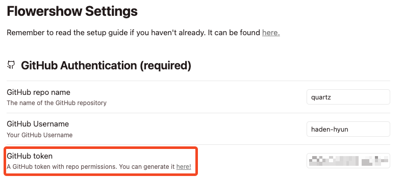 Flowershow 플러그인을 사용하면 옵시디언 노트를 깃허브 저장소에 업로드 한다. 해당 플러그인을 설치한 후 다음과 같이 Github 설정을 작성해야 한다.