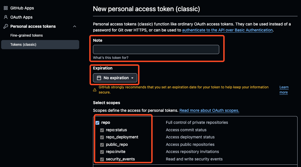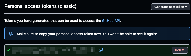 그러나 그전에 Github 저장소에서 접근 토큰을 발급 받아야한다. 여기를 눌러 토큰을 생성한다.(단, Tokens (classic) 탭에서 작성한다.)